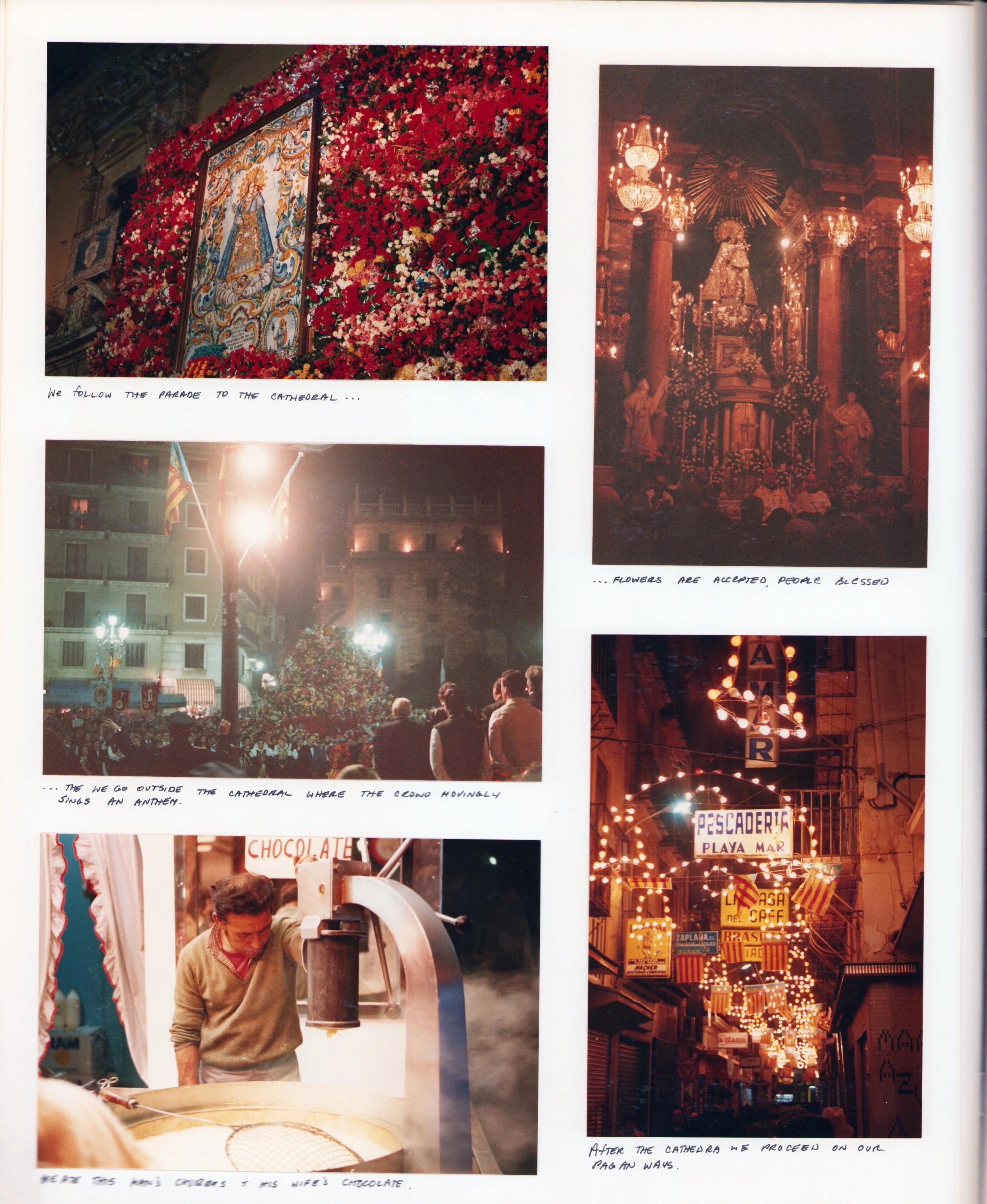Sunday eve, March 18 - Valencia & the Fallas!! We arrive in Valencia to watch the parade where many of the neighborhoods' residents march to the cathedral, carrying flowers to the Virgin; Bands playing 'Valencia' always got the most applause.
